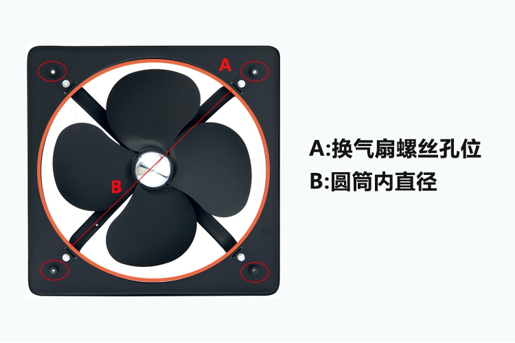 圓形孔位安裝考慮方排的圓形內徑大小,如:孔位為直徑300m的圓形孔位,只需選擇內圓框直徑為300mm的換氣扇產品即四周再用螺絲鎖住即可。