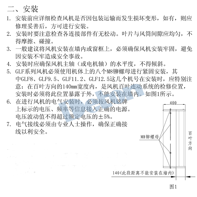 注意事項:風機安裝時應注意風機的水平位置,調整到風機與地面水平穩固。安裝后電機不可有傾斜現象